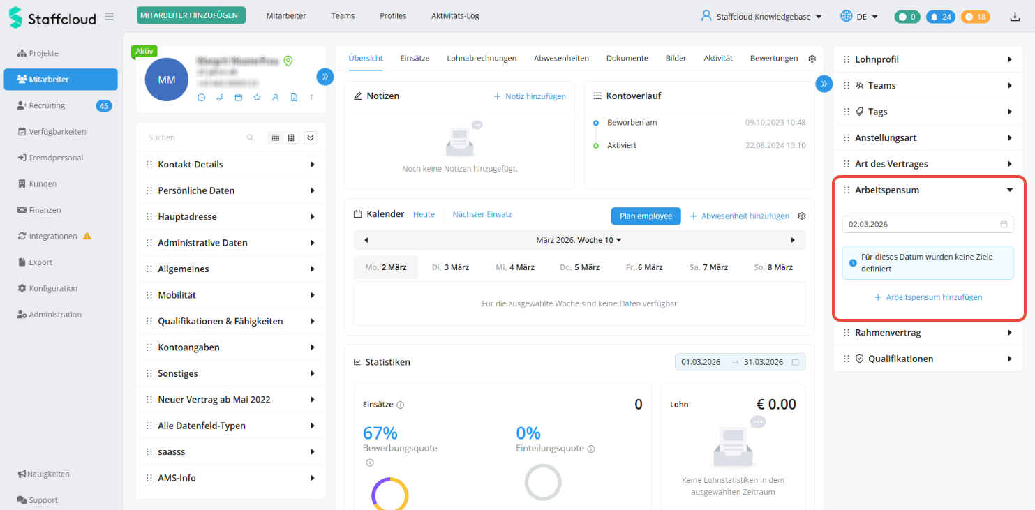 Die Sollarbeitszeiten werden im Profil des Mitarbeiters in der rechten Spalte unter "Arbeitspensum" eingegeben.