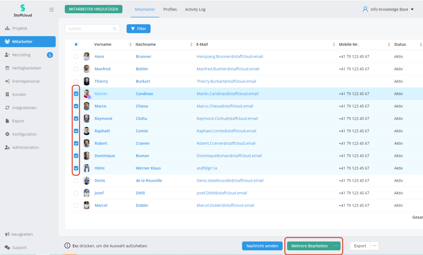 Man wählt die gewünschten Mitarbeiter mittels Häkchen aus und geht auf "Mehrere bearbeiten":