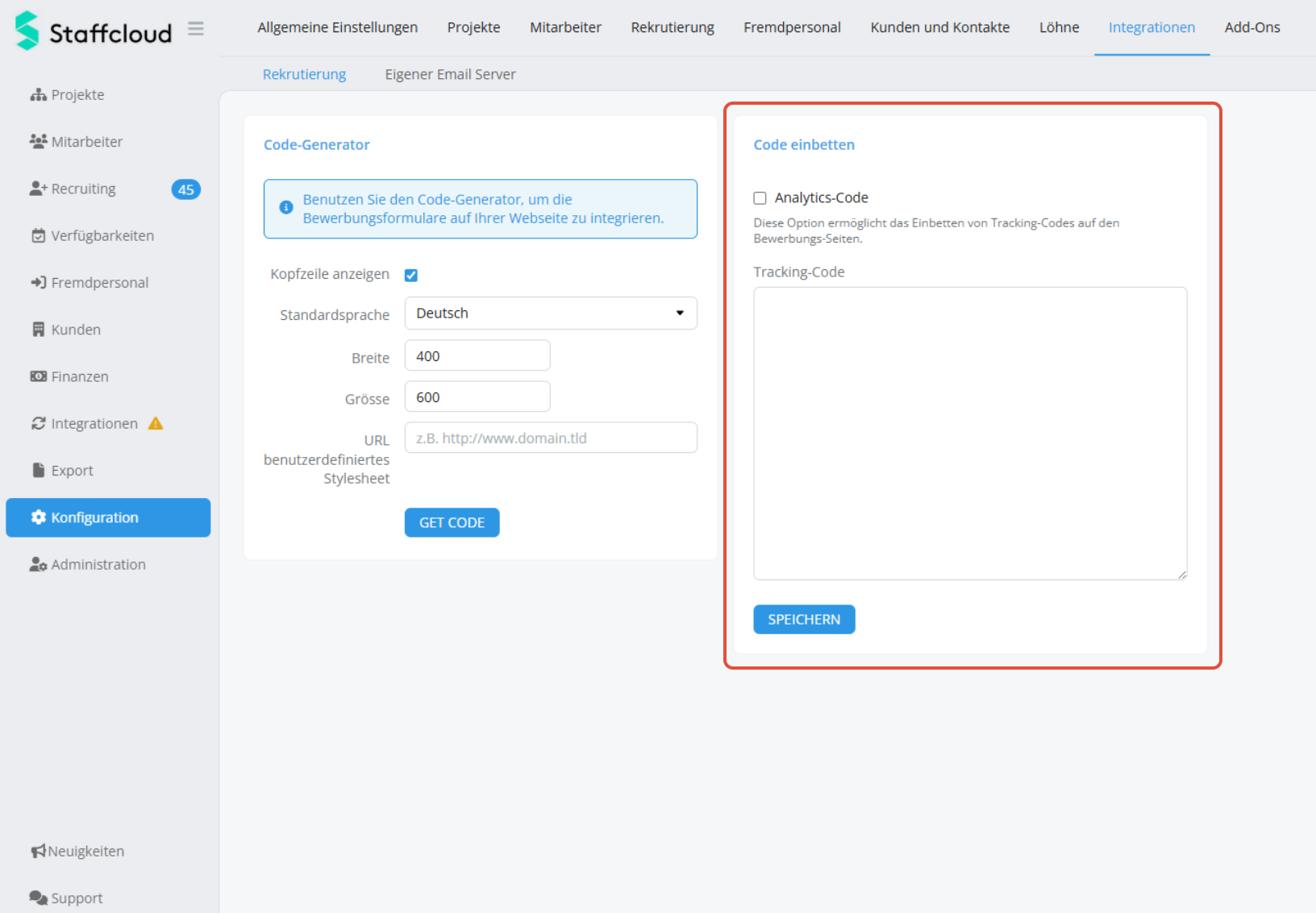 Nachdem Sie den Tracking Code aus Ihrem Tracking Tool extrahiert haben, navigieren Sie in der Staffcloud zu "Konfiguration" > "Integrationen" > "Rekrutierung". Dort finden Sie im Bereich "Code Einbetten" ein Eingabe-Feld "Tracking Code", wo Sie den Code einfügen können.