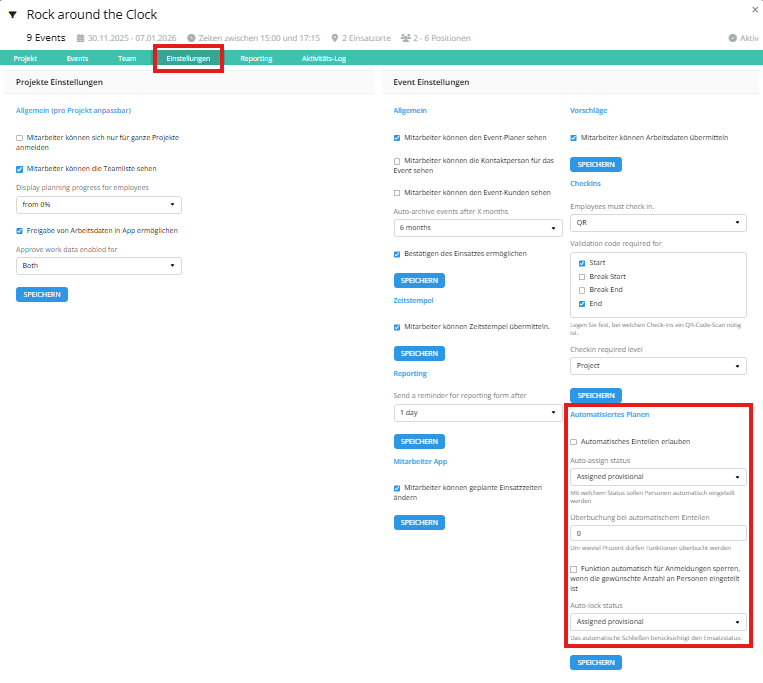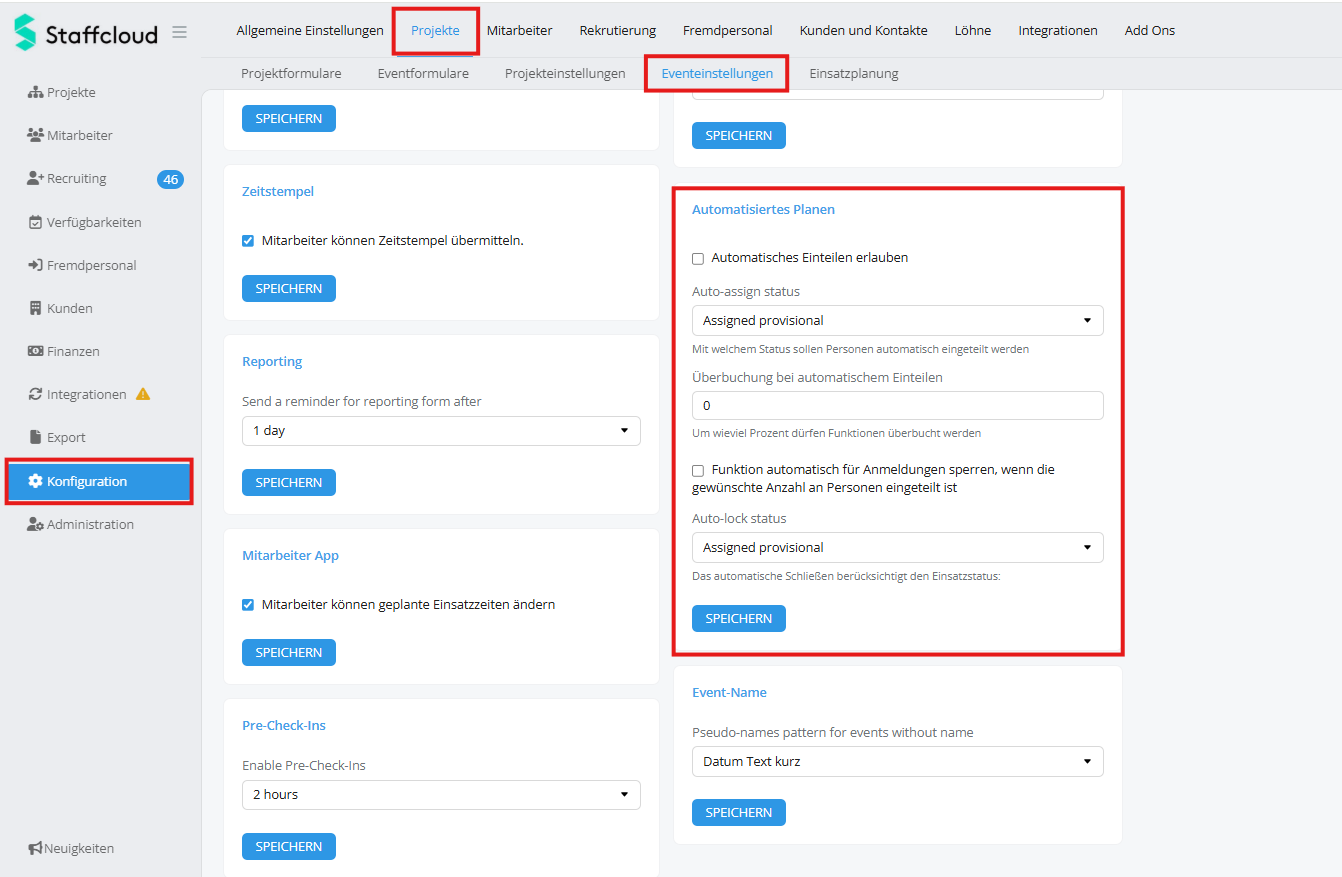 Konfiguration → Projekte → Eventeinstellungen