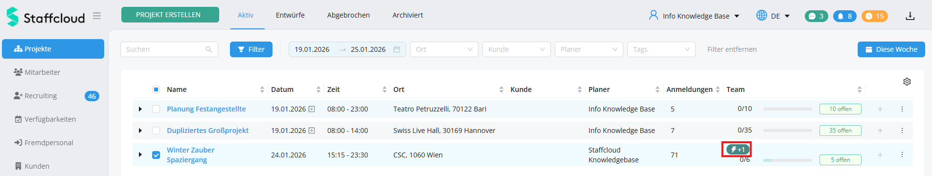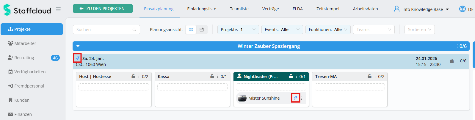 In der Projektübersicht erkennt man ebenfalls am Blitz-Symbol, wenn Personen automatisch eingeteilt wurden: