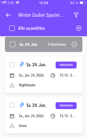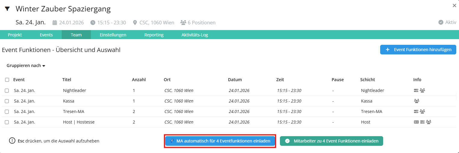 Die automatische Einladung zu den einzelnen Funktionen wird nur an jene Mitarbeiter:innen verschickt, die qualifiziert sind, zum Einsatzzeitpunkt keinen anderen Einsatz haben und keine Abwesenheit in ihrem Kalender eingegeben haben.