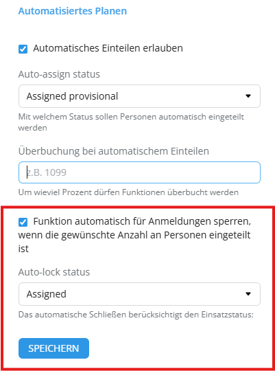 Mit dem automatischen Schliessen wird eine Funktion automatisch für neue Anmeldungen gesperrt, sobald sie vollständig besetzt ist. Die Einstellung kann wie das Automatische Einteilen sowohl Global als auch pro Event gesetzt werden