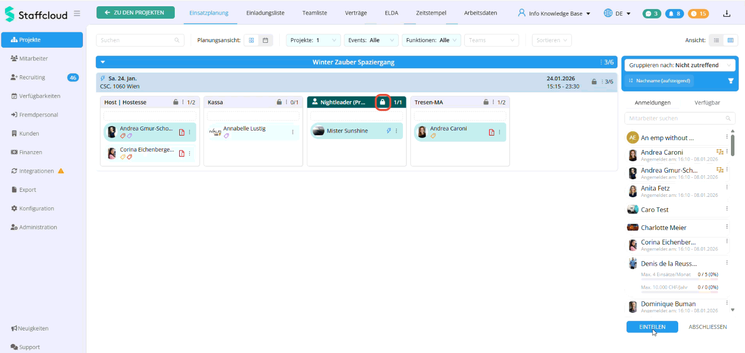 • Die Funktion wird sofort geschlossen, sobald die gewünschte Anzahl an Mitarbeitenden eingeteilt ist