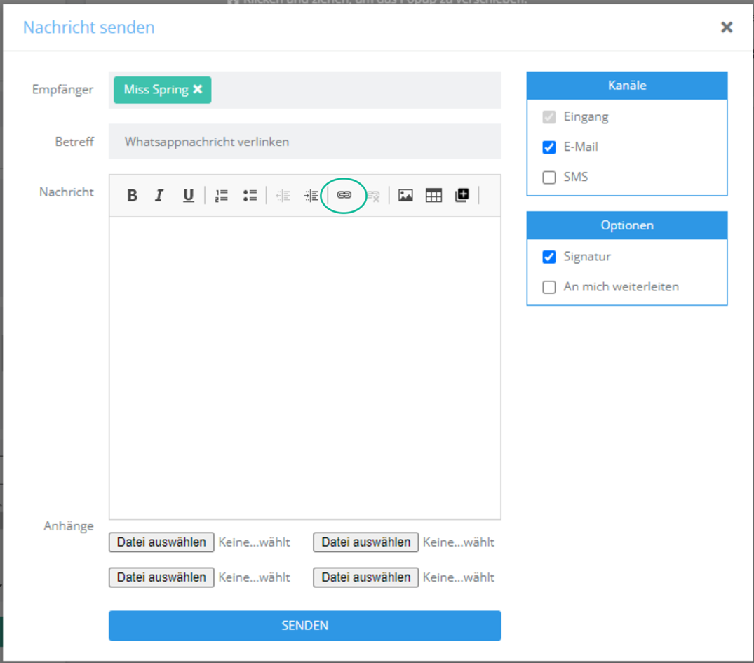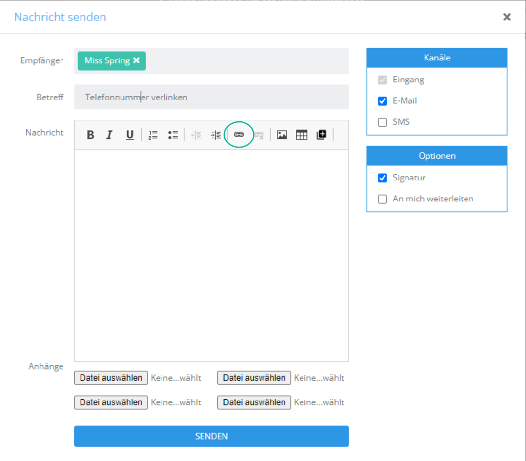 Klicken Sie auf das "Link"- Symbol im Nachrichten-Editor: