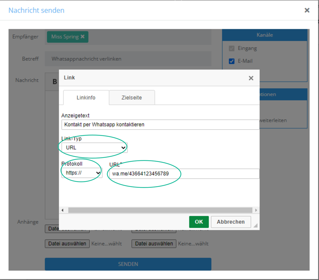 Die Telefonnummer oder der WhatsApp-Kontakt kann in jedem "Rich Text Editor"- Feld verlinkt werden, ebenso wie in den via Staffcloud versandten Nachrichten.