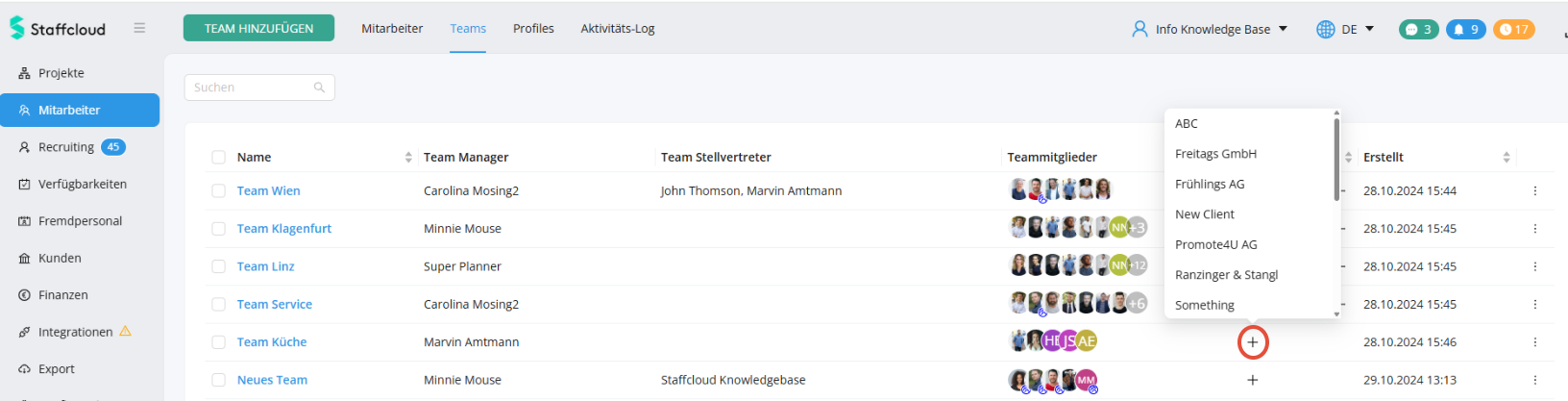 Nutzen Sie in der Teamübersicht das "+" Symbol, um Kunden mit einem Team zu verknüpfen: