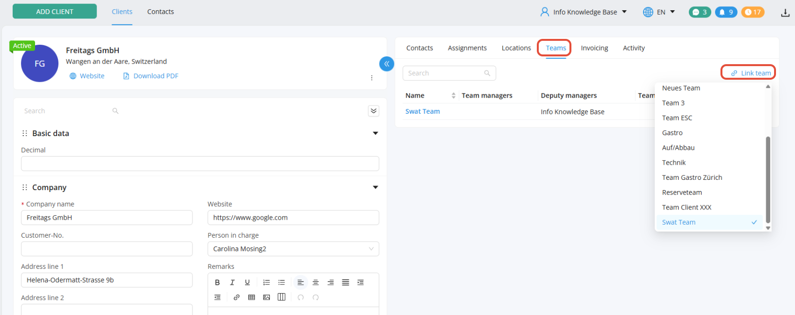 Wählen Sie einen Kunden und verlinken Sie diesen mit einem oder mehreren Teams: