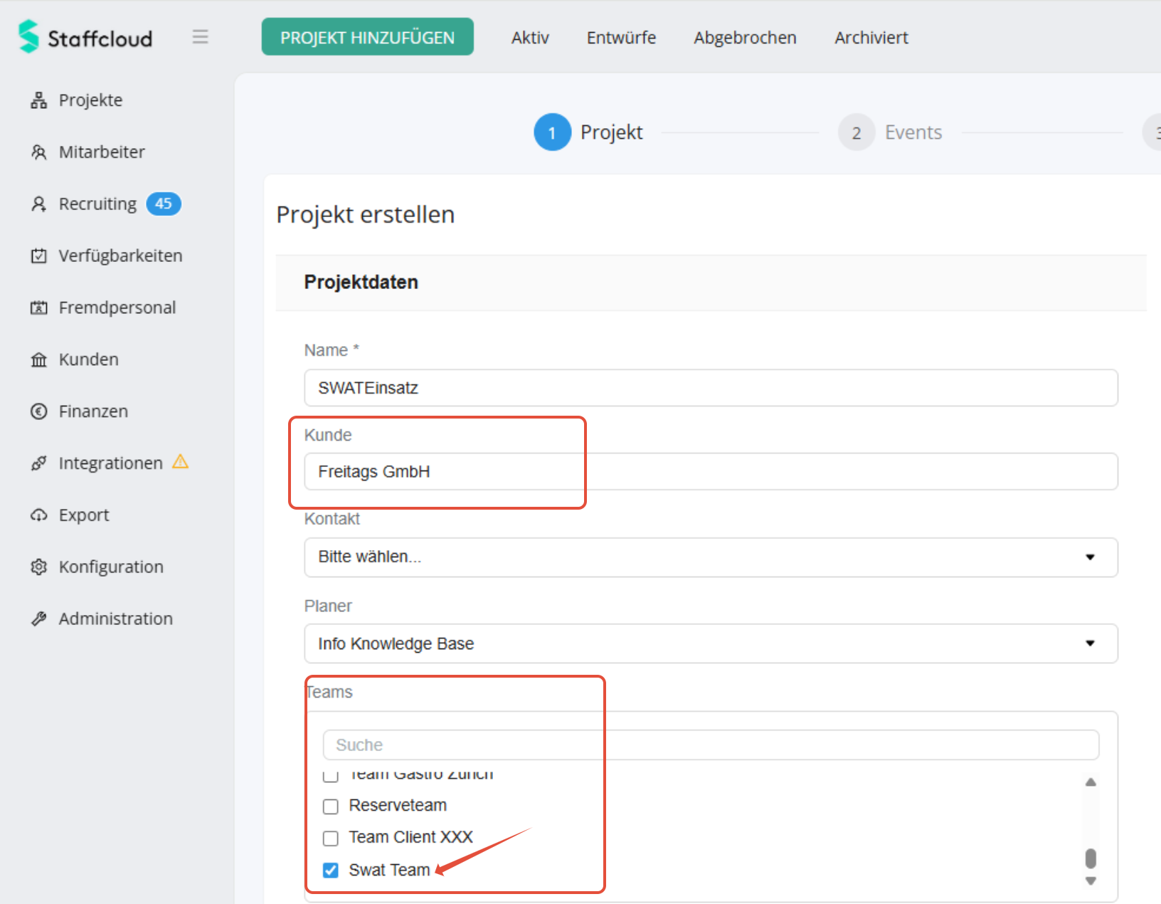 Bei der Projekterstellung können Sie Teams definieren. Wenn Sie einen Projektkunden auswählen, der bereits mit einem oder mehreren Teams verknüpft ist, werden diese Teams automatisch angewählt:
