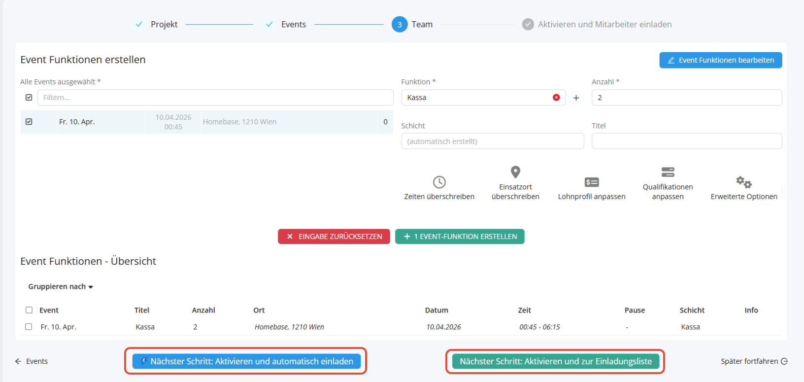 Nach Erstellung des Projekts werden durch anwählen von "Aktivieren und automatisch einladen" direkt alle qualifizierten und verfügbaren Teammitglieder eingeladen.