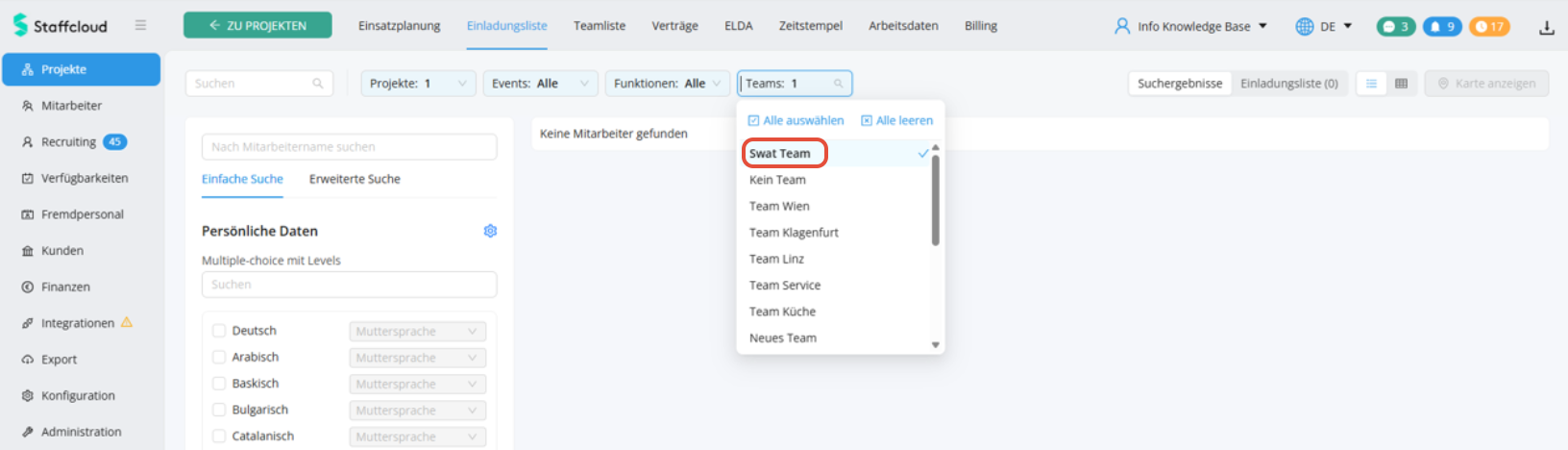 Zusätzlich können Teams mit Kunden verknüpft werden. Teams lassen sich in der Einsatzplanung, im Bereich Verfügbarkeiten sowie in der Mitarbeitersuche als Filter verwenden. So können Sie schnell nach einem oder mehreren Teams filtern und Ihre Planung übersichtlicher gestalten.
