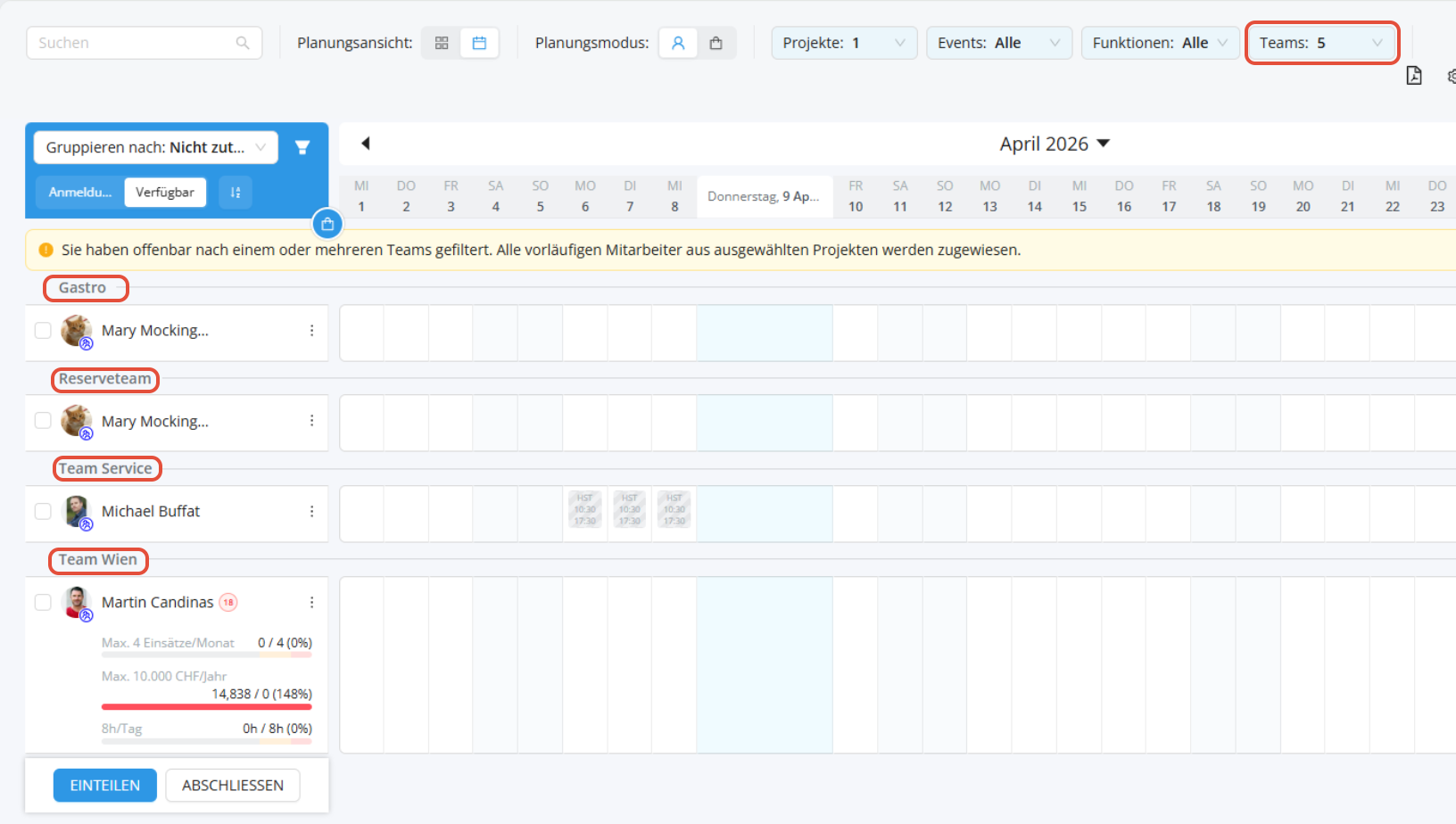 Die Filterung nach Teams erleichtert Planern die Übersicht, insbesondere wenn einzelne Planer nur für bestimmte Teams zuständig sind.