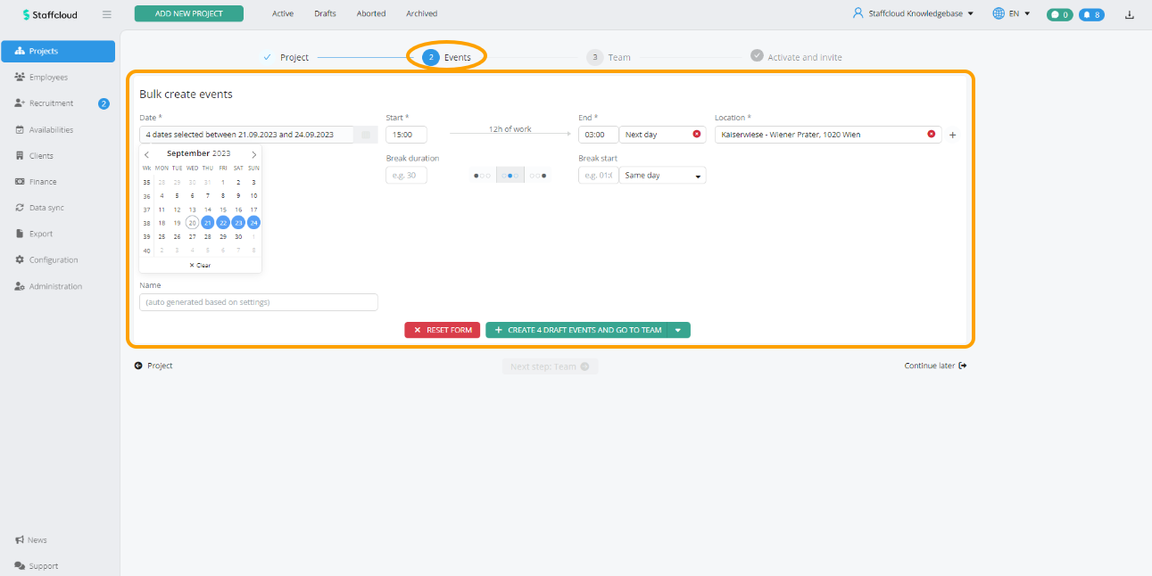 Once all data is entered, your event can be created. To do so, please click on the button ‘Create draft event and go to Team’.