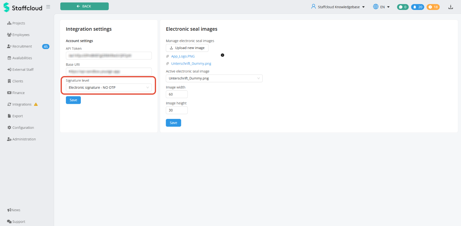 The signature level for processing contracts can be defined in the “Integrations” > “Name of signature provider” > “Account settings” > “Signature level” section.