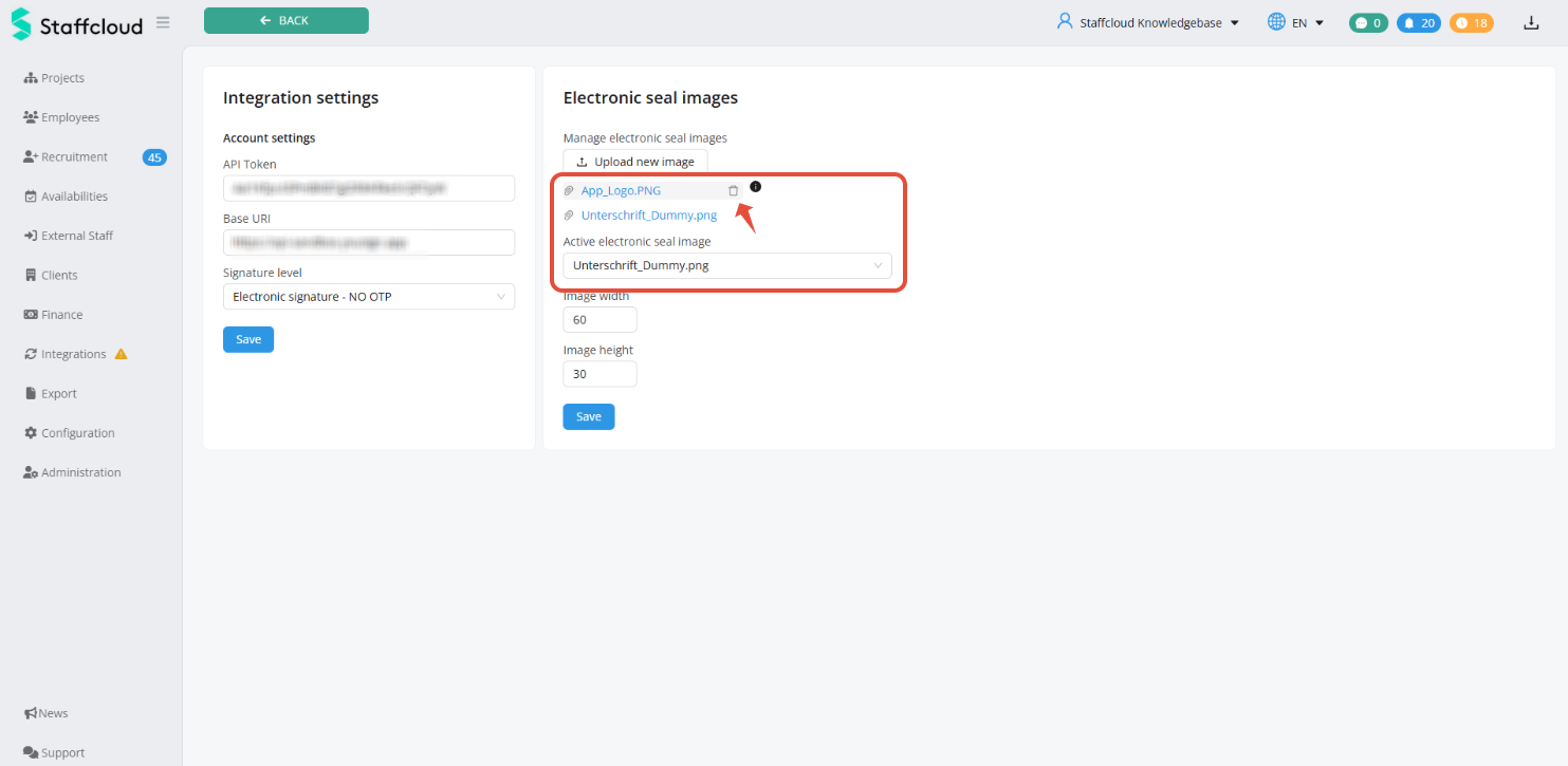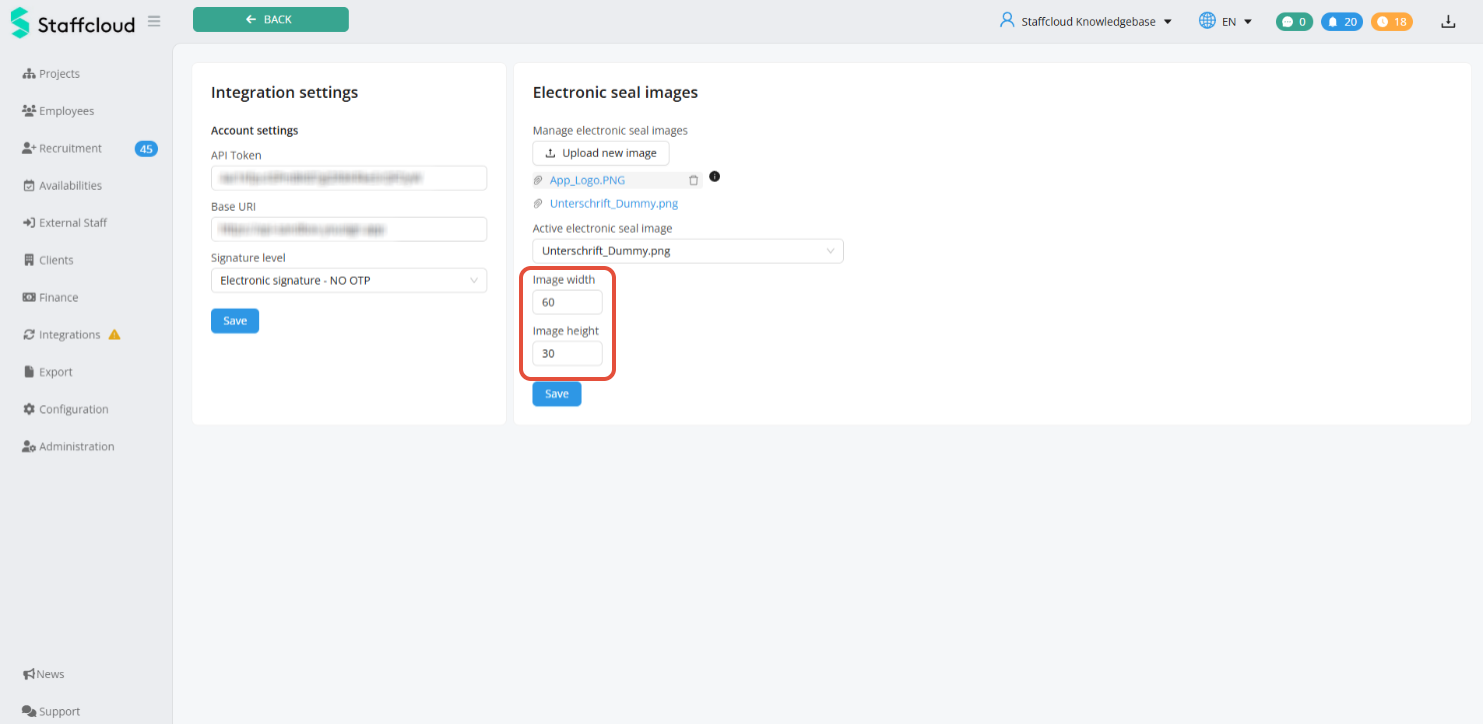 The display size of the electronic seal in the contracts can be controlled using the “Image width” and “Image height” fields. Adjust the pixel values to the aspect ratio of your files.